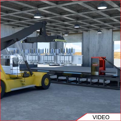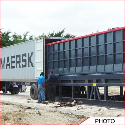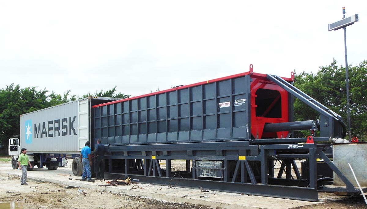 Equipment container loader using the Acculoader flat version for pushing Equipment into a container.