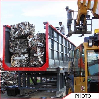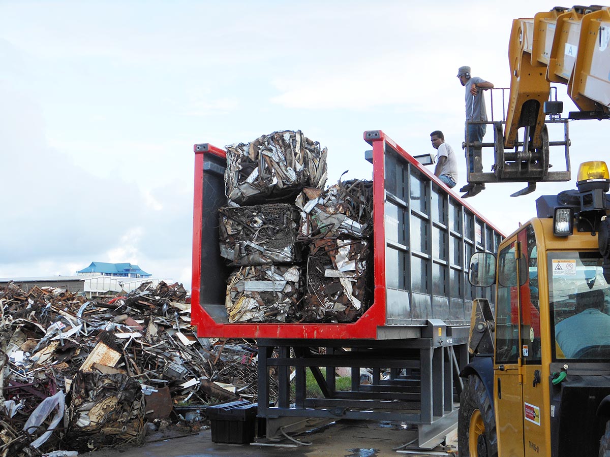 Recycling compacted Scrap metal ready for loading into a shipping container.