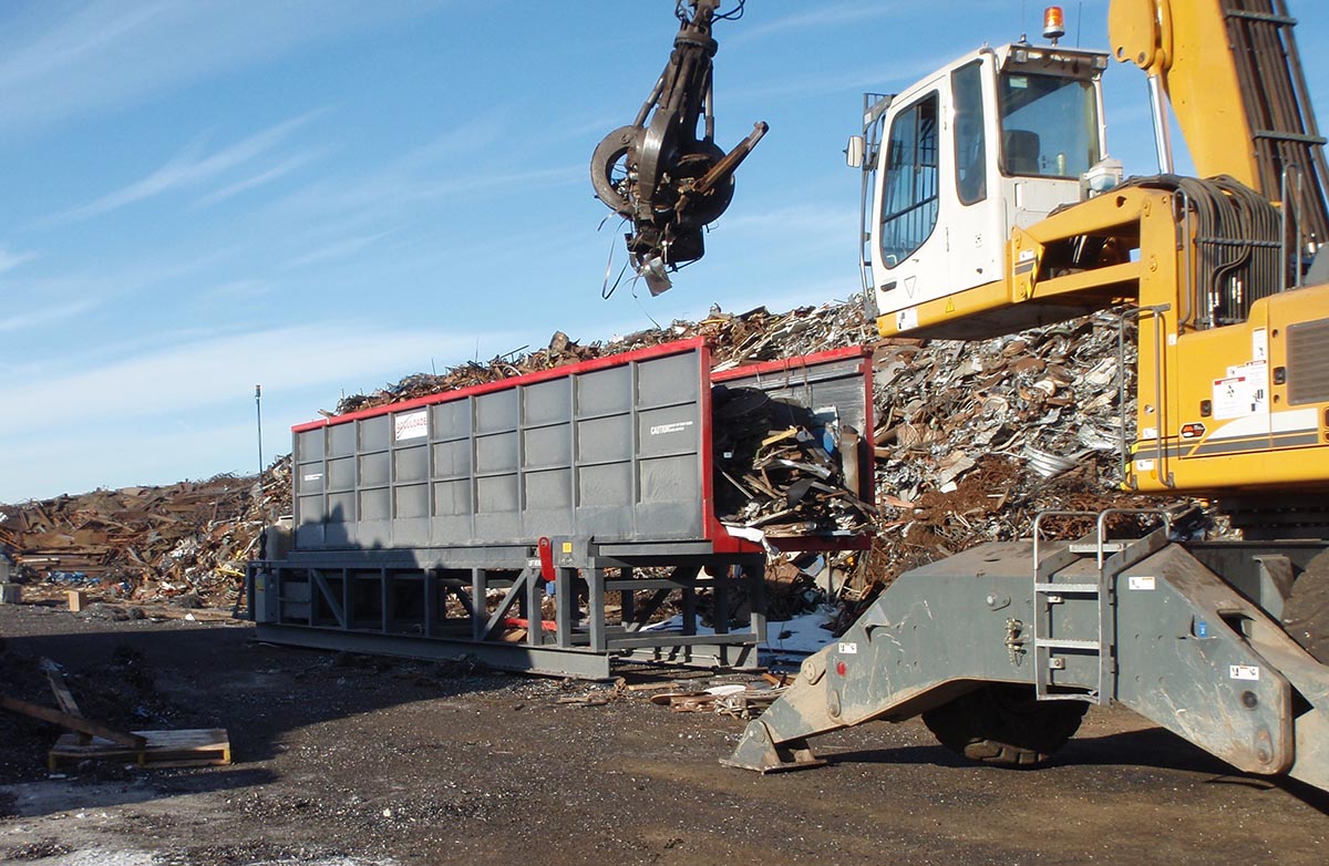 Scrap steel container loading using a magnetic loader to load the Acculoader